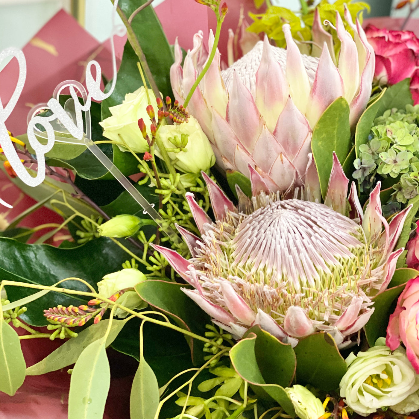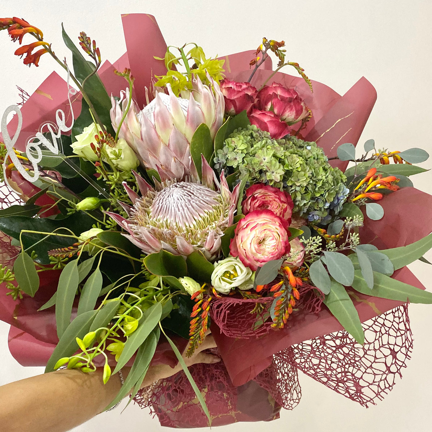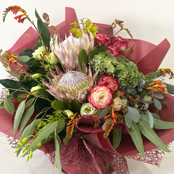 King Protea, Roses, Hydrangeas, fillers and foliage