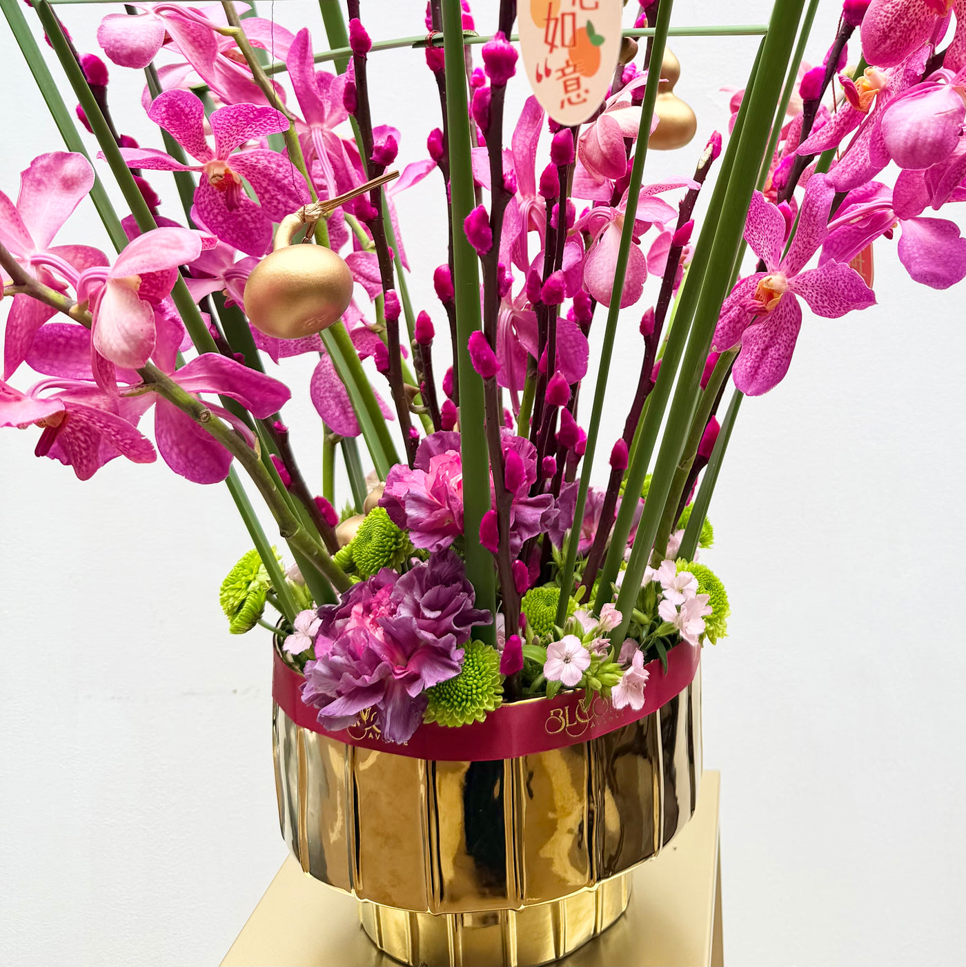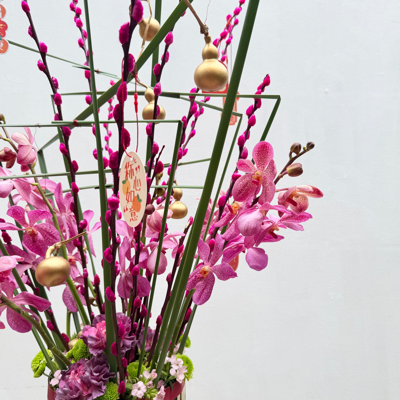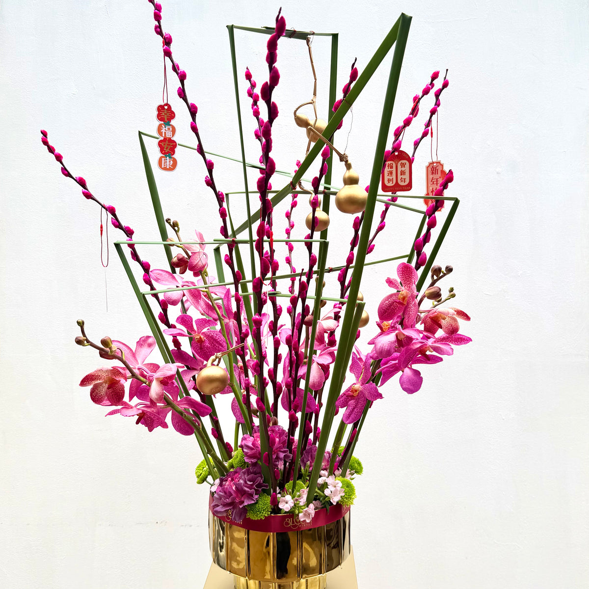 A graceful arrangement of Orchids, Pussy Willow, mini Bottle Gourd, symbolising growth, protection, and rising success—perfect for welcoming prosperity in the New Year! 葫芦 Bottle gourd is popular in Chinese New Year decorations and arrangements as symbols of wealth, prosperity and well-being!